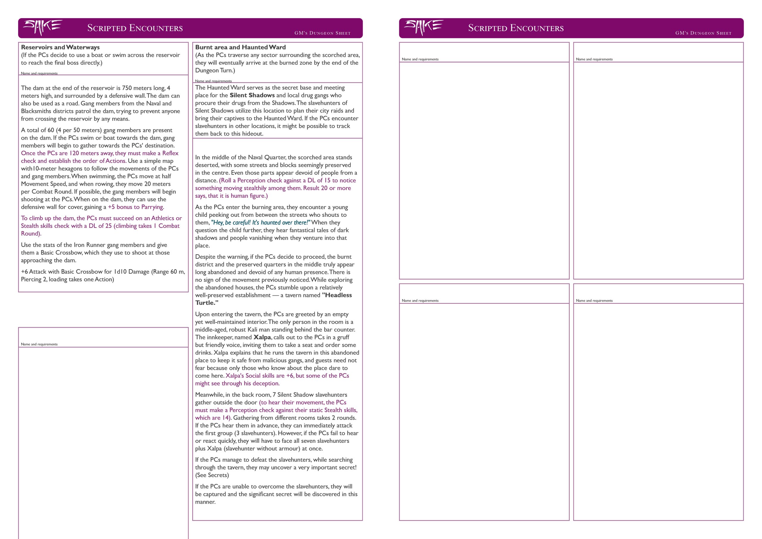 The second Scripted Encounter will be the reservoirs and canals around the city districts because the players may question whether it is possible to avoid traversing the districts and instead cross these bodies of water by swimming or finding a boat to reach the final boss. This would mean the PCs would bypass most of the dungeon, but such an option must remain available to them. Therefore, we define this as a Scripted Encounter.
