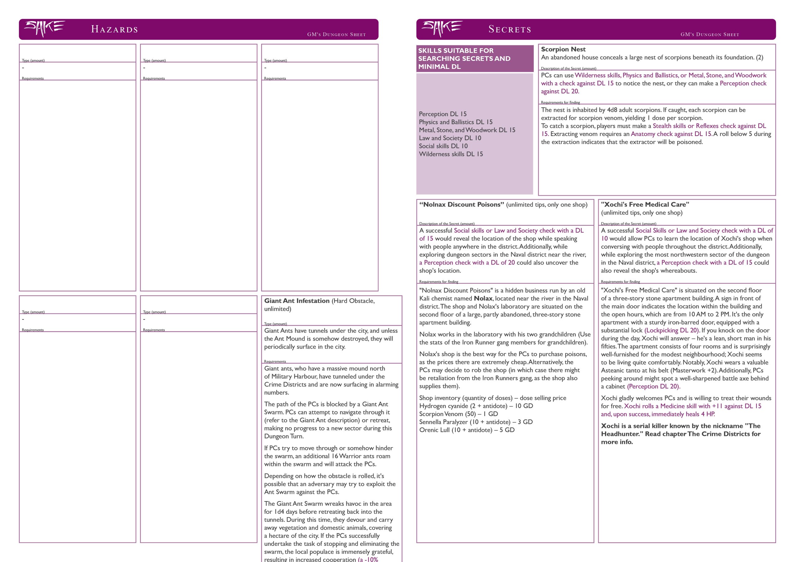 After gathering all existing materials, I am now reviewing them, adding some Hazards, Opportunities, and Secrets.